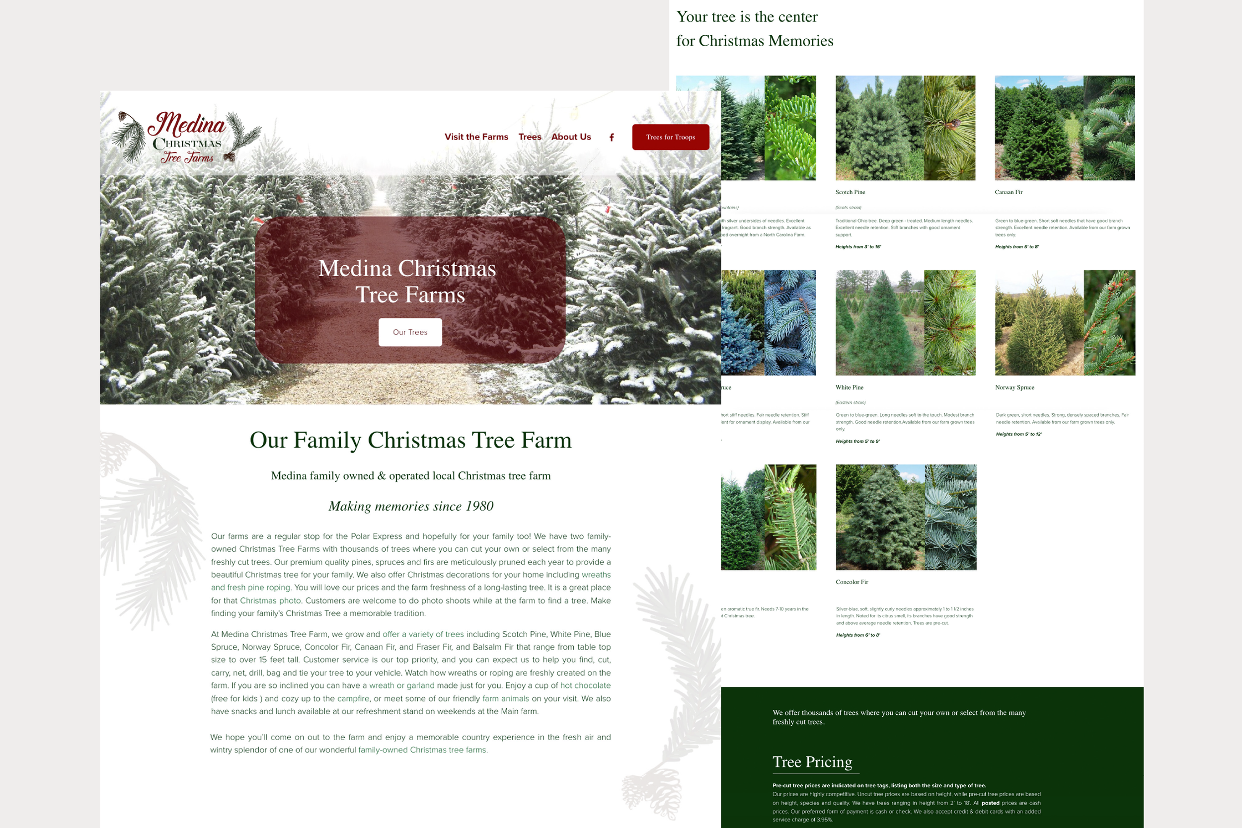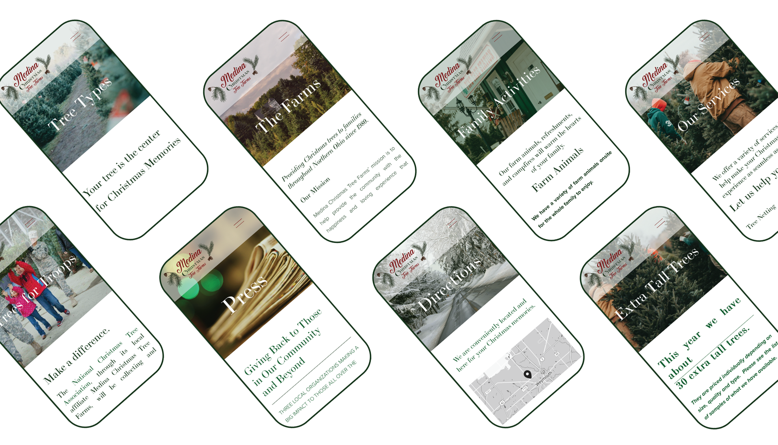 The website design for Medina Christmas Tree Farm is aimed at creating a user-friendly and visually appealing experience while highlight the farm's history, values, and traditions. What sets this farm apart from buying your tree at a big box store is the Christmas experience. Drawing inspiration from the customer experience the main focus for the website is making Christmas memories with your family.