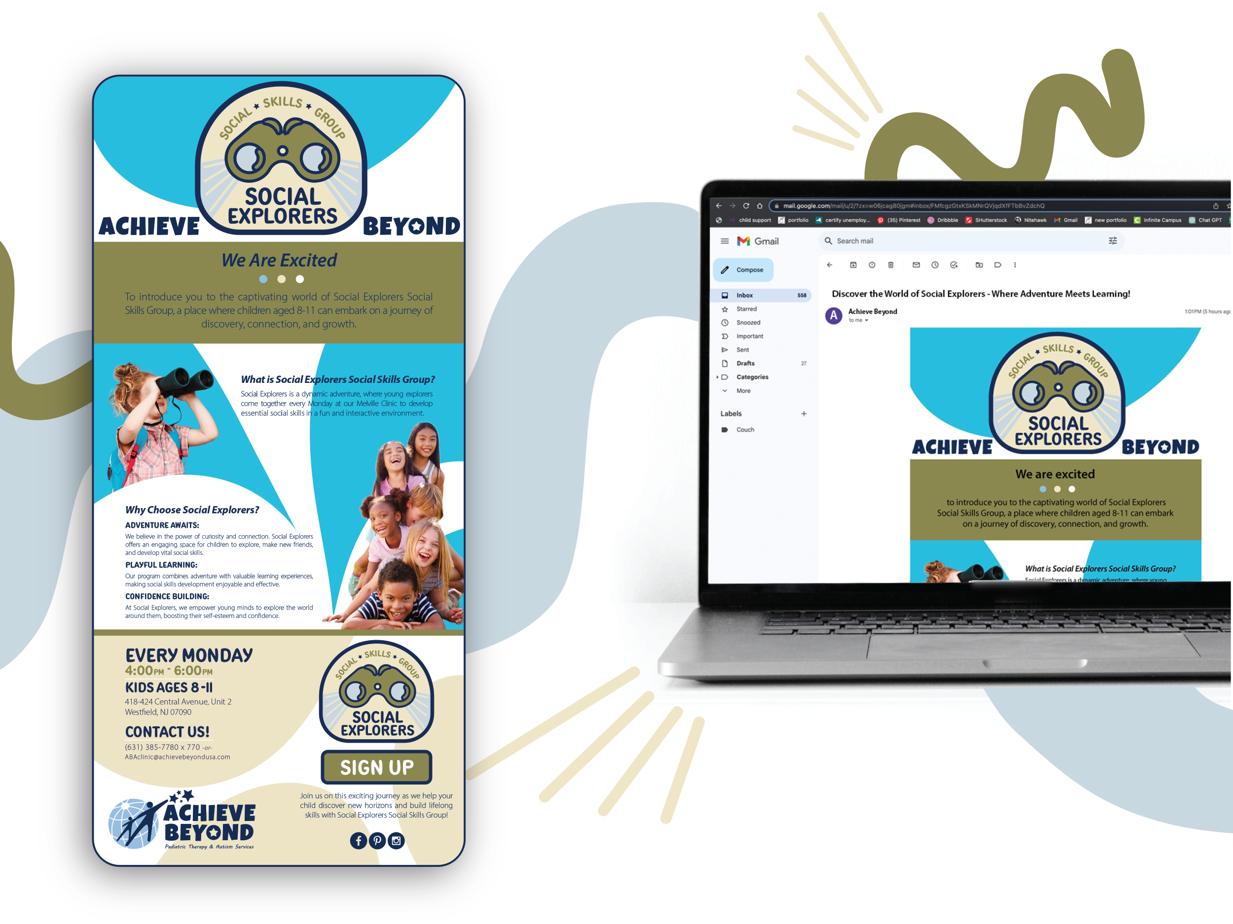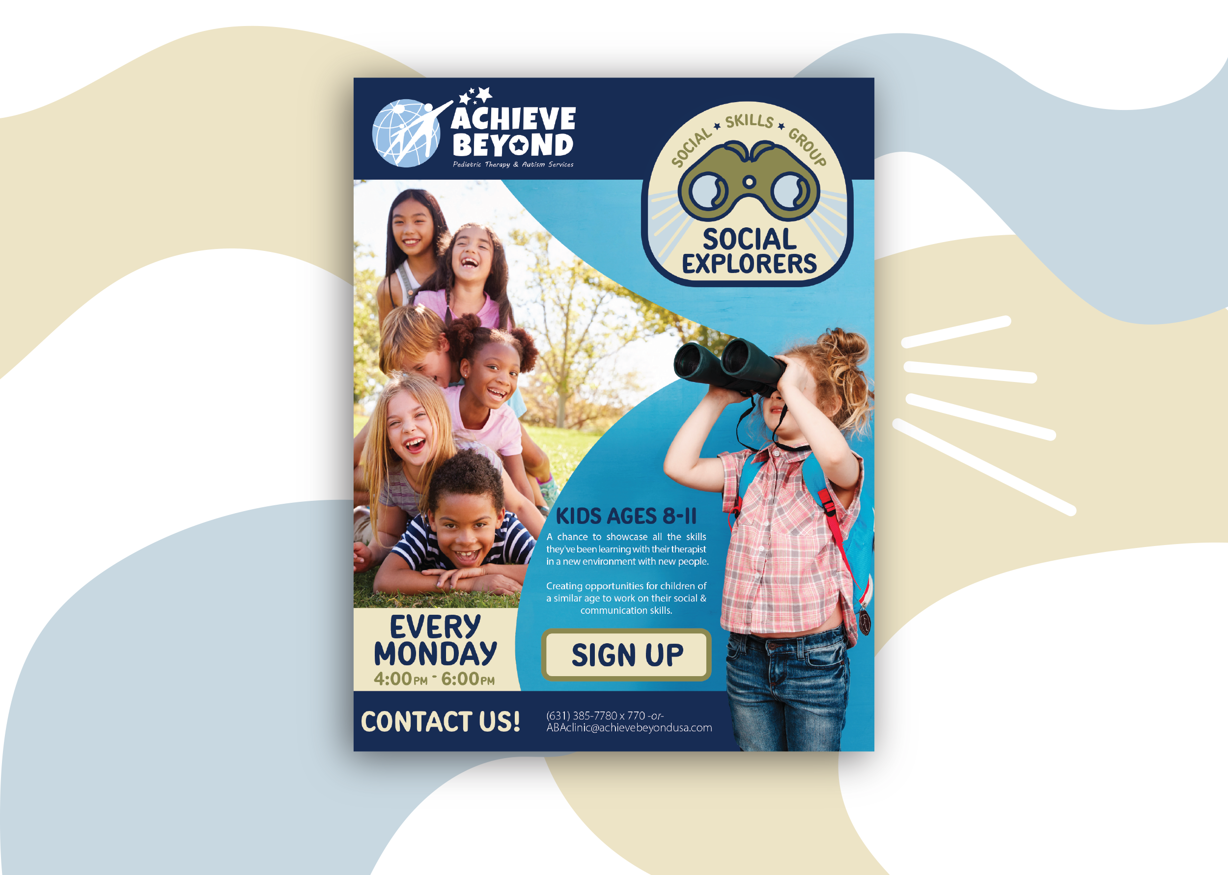 Printed Flyer: Serving as the campaign’s foundation, the flyer reflects the Social Explorers journey. A curious child peers through binoculars, her view swirling open to reveal a joyful scene of children laughing together. This visual storytelling reinforces the program’s mission—turning everyday moments into extraordinary opportunities for growth and connection.