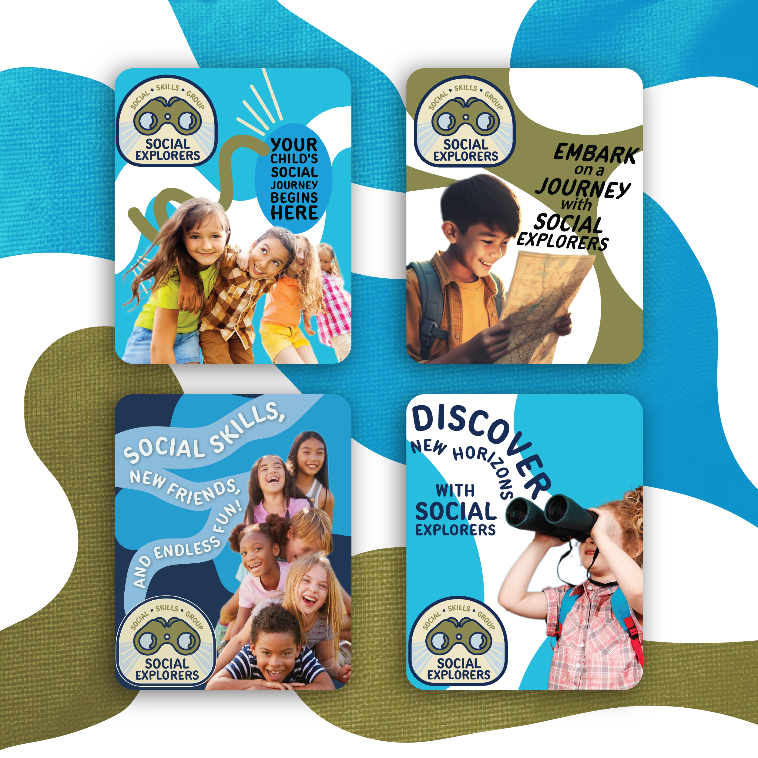 Paid Social Media Campaign: The Social Explorers paid social ads capture the excitement of discovery. Each ad highlights the joy of making new friends and developing social skills, supported by copy that reinforces the program’s transformative impact. The cohesive color palette and adventurous imagery create a consistent, engaging brand presence.