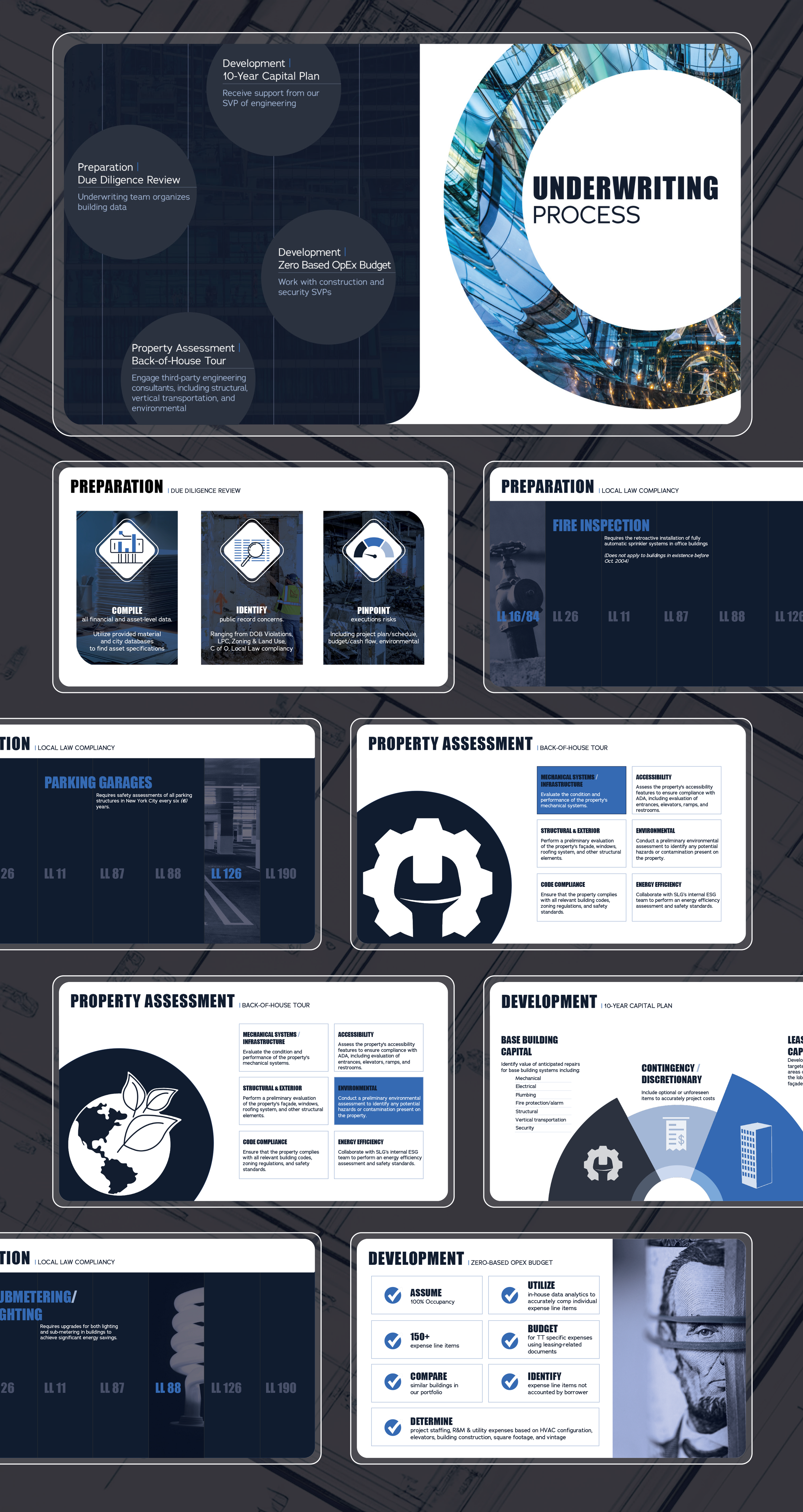 I was tasked with redesigning SL Green Realty’s existing underwriting PowerPoint presentation. The goal was to introduce a fresh, modern design aesthetic while preserving a professional, corporate look. To achieve this, I created multiple animated builds within the design, ensuring the visuals remained engaging and dynamic. The result was a polished, visually appealing presentation that effectively communicated key information and kept the audience engaged throughout.
