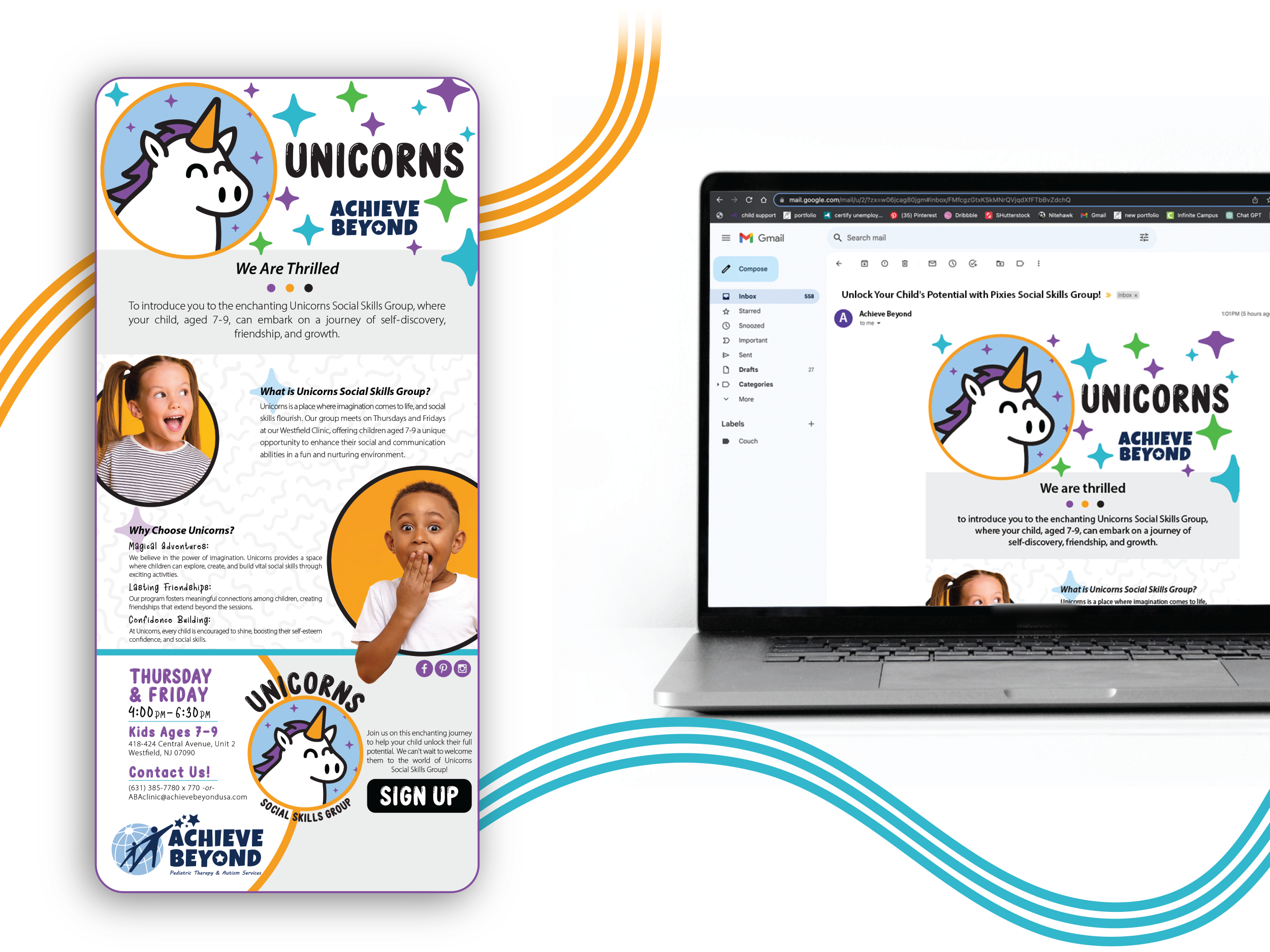 The Unicorns Social Skills Group campaign is designed to foster connection and growth for children aged 7 to 9. Featuring bold, whimsical unicorn illustrations with a sticker-like aesthetic, the campaign invites children into a world of magic and friendship.